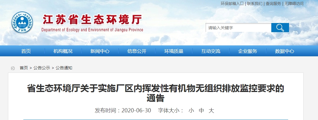 省生態環境廳關于實施廠區內揮發性有機物無組織排放監控要求的通告